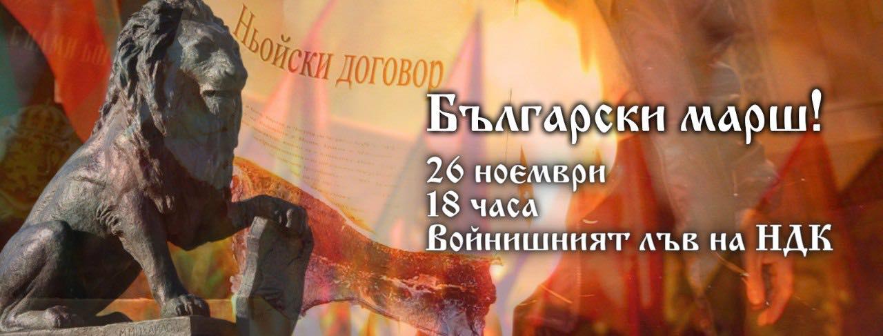 Факелното шествие Български марш, посветено на 100-годишнината от подписването на Ньойския договор, в петък вечер огласи централните софийски улици с викове „Долу Ньой! Мизия, Тракия, Македония! Западните покрайнини - в България!“. Шествието, водено от момичета и момчета с народни носии и знамена, тръгна от Войнишкия лъв, част от мемориала на Първи и Шести Софийски полк в градинката на НДК. В първите редици шестващите носеха транспаранти „Български марш: 100 години от Ньойския диктат“ и „Западните покрайнини: завинаги български“.
