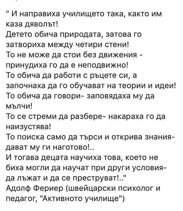 А цитираният от теб Адолф Фериер е всъщност краен либерален педагог, един от радетелите на т.нар. педоцентричен подход, който не изисква дисциплина от децата, а ги оставя да си правят каквото си поискат, вследствие на което те стават разхайтени, разглезени, необучаеми и започват да си мислят, че знаят всичко и са прави, а възрастните просто са закостенели глупаци. Така се появяват Гретите. В Скандинавия в това отношение е страшно.