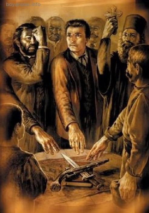 Най-правилният начин на даване на клетва си остава този на хайдутите от които Левски взаимства. Променя само това че слага вместо два ножа- нож и револвер. Предполагам понякога е лагал и два ножа - според , както се случи.