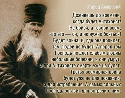 "Наближава времето на края на света, наближава времето на Антихриста. Наближава времето, когато Антихристът ще вдигне особена борба срещу Православната църква - да убие вярата, да лиши хората, да ги откъсне от Източника на Живата вода, да ги докара до смърт - това е задачата на Антихриста. И сега слугите на Антихриста изпълняват тази задача. Дори колкото до Антихриста, слугите на Антихриста действат зло (гоненията не помогнаха), сега обратното, по-коварни са измислили слугите на дявола - разделят, разделят, правят Църквата неблагодарна. (... ) Страх ни е от тия разни финтифли там - карти там, и цялата нечистота, и от тая нечистота бездушна: "Каква разлика му е калпазанин, какъв епископ", маха с ръка и отиде да се моли, т.н. Това е страшно - нашето безразличие! Отдалечихме се от Христос, отдалечавайки се от Източника на Живата вода и се насочи към погибел е най-страшният начин някога. И все пак мнозина съзнателно ще загинат сега. Това са времената - наближават дяволски, антихристови времена. Вече няма гонения и вече сме в беда, и ще дойде време на тежки гонения, тежки мъчения, затвори, връзки, подигравки, смърт на мъченици от Антихриста, тежка кръв, какво е Апокалипсис. Когато децата ще бъдат изтезавани пред очите ни. Кой е готов за това? Никой, всеки ще вика: къде е Богът, кой ни наказва и другите, и другите... Ето я нашата вяра. Така че сравнете се с това радостно лице на Самарянка и нейната духовна преданост... ""