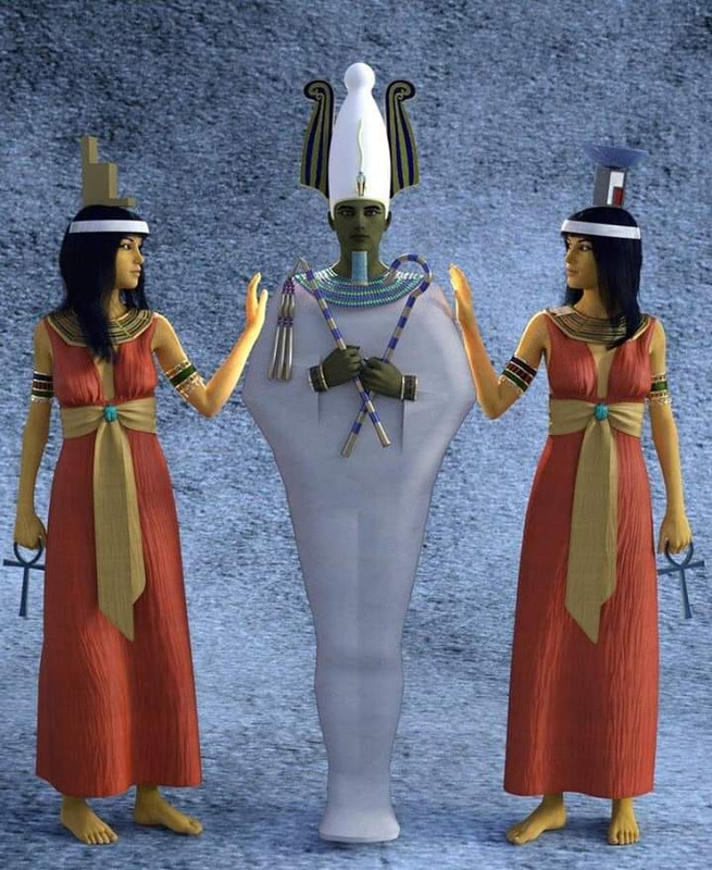 Египетския бог Озирис (в средата), отляво богинята Изида, отдясно богинята Нефтида