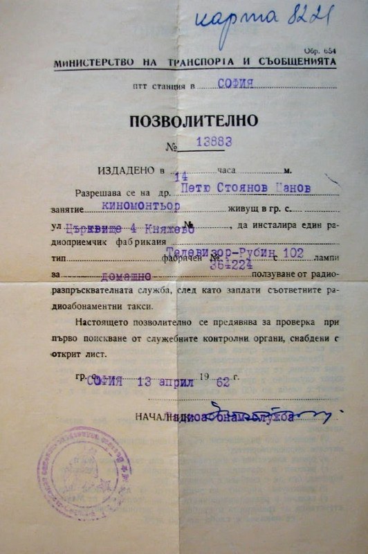 Документ позволяващ притежанието на личен телевизор в социалистическия "рай", наречен Народна Република България