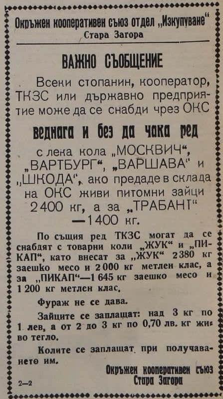 Изборът беше измежду съветските ЗАЗ, “Москвич”, “Жигула”, “Лада” или “Волга”; чехословашката “Шкода”; източногерманските “Трабант” и “Вартбург”. Последните - по-рядко и то в последните години на стария режим. "Картоненият" Траби излизаше 5600 лв.
