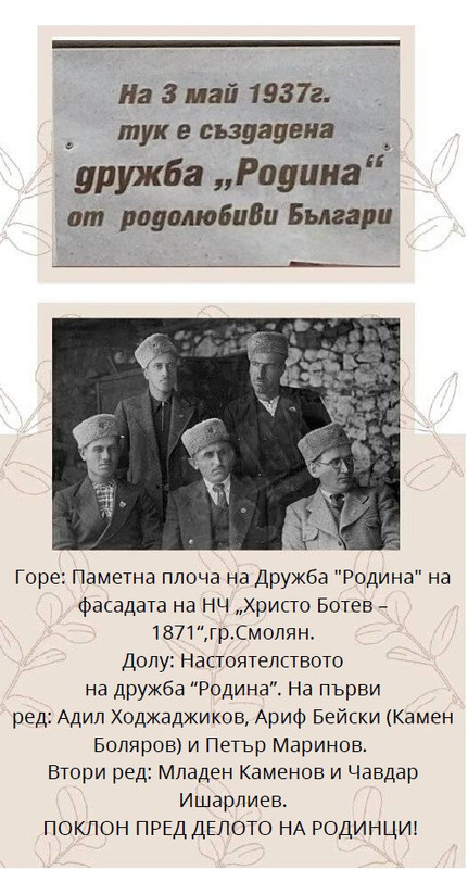 На 3-ти май 1937г. група млади хора, събрани в Народно читалище „Христо Ботев – 1871“ в град Смолян, основават Българомохамеданската културно-просветна и благотворителна организация Дружба "Родина“!