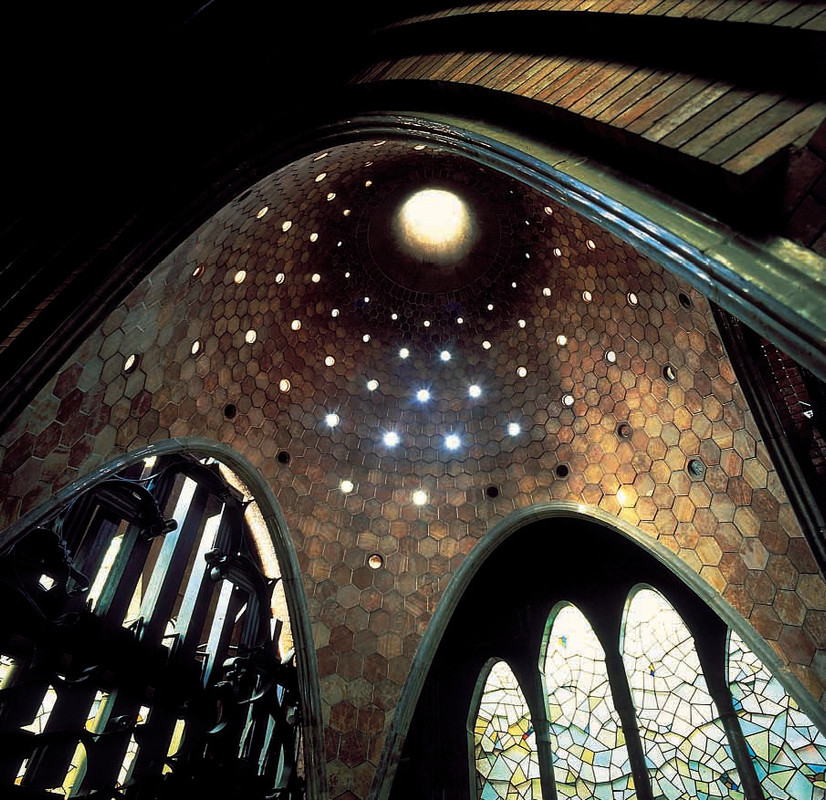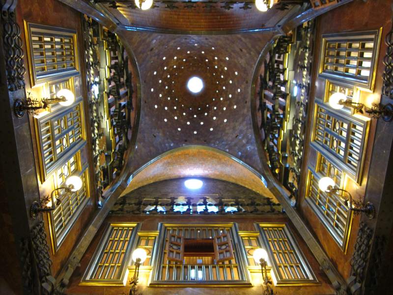 Дворецът на Гюел е бил построен през 1918 г. от Антонио Гауди. В лобито на двореца светлината, която пада през прозорците, се смекчава от три параболични арки, съставени от сиви, гладко полирани колони. Високите арки създават впечатление за готически прозорец, но прозорците, направени от Гауди в двореца на Guell, са правоъгълни. С други думи, служат за контрапункт на линиите на арките. Те разкриват също и първите признаци на неговите тревоги с ар нуво, чиито елементи в началото на входа се повтарят във вътрешната страна на сградата. Поддържащите колони с щедри и многобройни декорации са дебели, сиви, с форма на гъба, гладко изравнени и направени от змийски камък, изкопан от кариерите на Пиренеите. Зала, простираща се на три етажа, образува центъра на сградата и е покрита от купол с многобройни кръгли дупки. Тя заменя нормалния вътрешен двор, който е бил там, но в същото време създава усещането, че стоиш в огромна барокова църква.