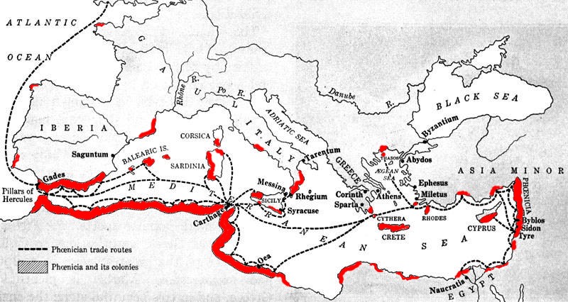 Между Х и VIII в пр. Хр. мореплавателите от почти всички финикийски градове са се чувствали пълни господари на Средиземноморския басейн. Особена активност те проявили по северния бряг на Африка и в южната половина на Пиринейския полуостров. В Африка те основали цяла редица търговски фактории и градове. Най-големи сред тях били Картаген, Утика, Еа, Лептис (по-късната Лептис Магна), Хипон и Магадор.
