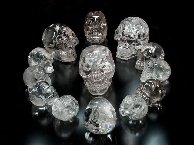 Кристалните черепи са 13 на брой и се съхраняват в музеи и частни колекции в Ню Йорк, Париж и Лондон. Представляват точни копия на човешките. Открити са в Централна Америка и Тибет. Експертите са на мнение, че са изработени преди хилядолетия. Майсторското им изпълнение свидетелства за изключително